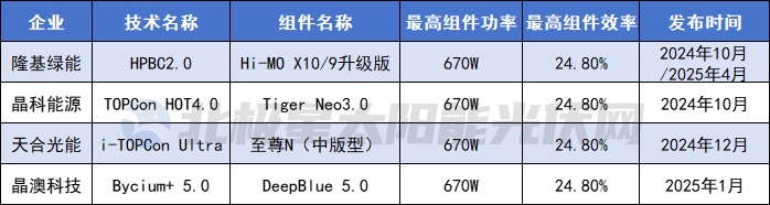 實際上,除市占率外,四大組件寡頭的護城河更是建立於技術領先。2024年下半年,技術迭代風暴口,隆基率先推出基於HPBC 2.0技術的全新組件新品Hi-MO X10,將組件量產效率拉高至24.8%。緊隨其後,晶科、天合、晶澳紛紛官宣新品,同樣追至24.8%。