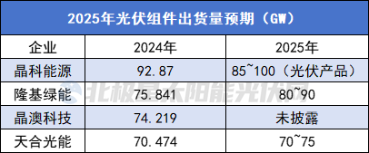 隻是產能供需矛盾未解,行業周期底部掙紮之下,頭部企業也難逃虧損命運。2024年度,除晶科保持盈利外,其他三巨頭淨利潤均大幅虧損。今年一季度,四大巨頭淨利潤更是無不為負。由此,對於2025年組件出貨目標,晶科、隆基、天合僅預期同比微漲。